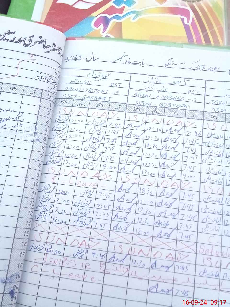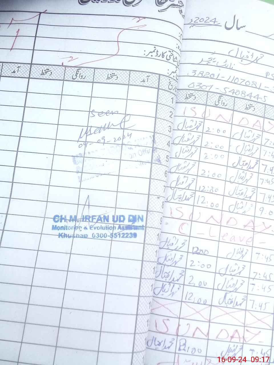 | CNIC | Full Name | Designation | R/C | Absence during last cal. month |