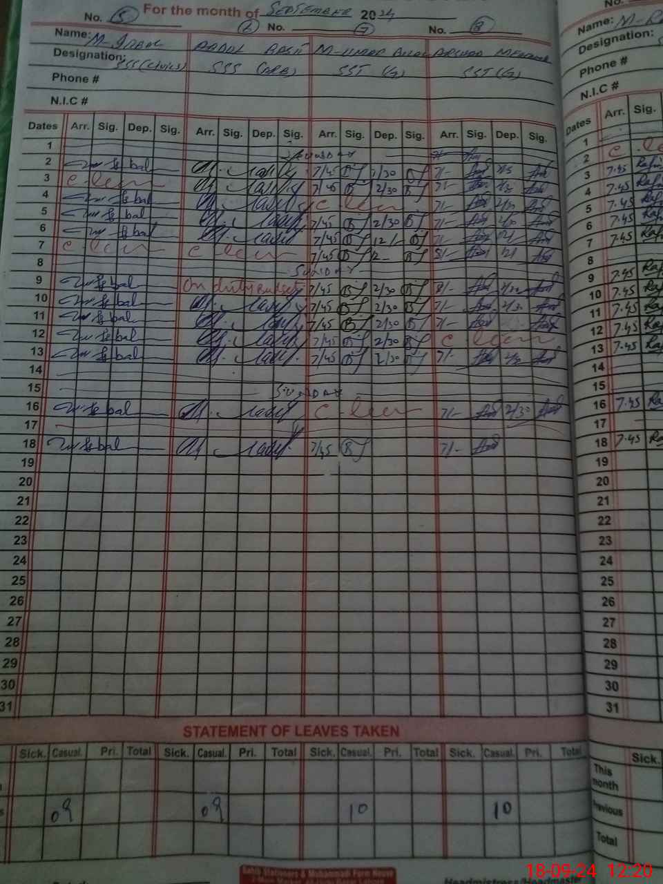| CNIC | Full Name | Designation | R/C | Absence During Last Calender Month |