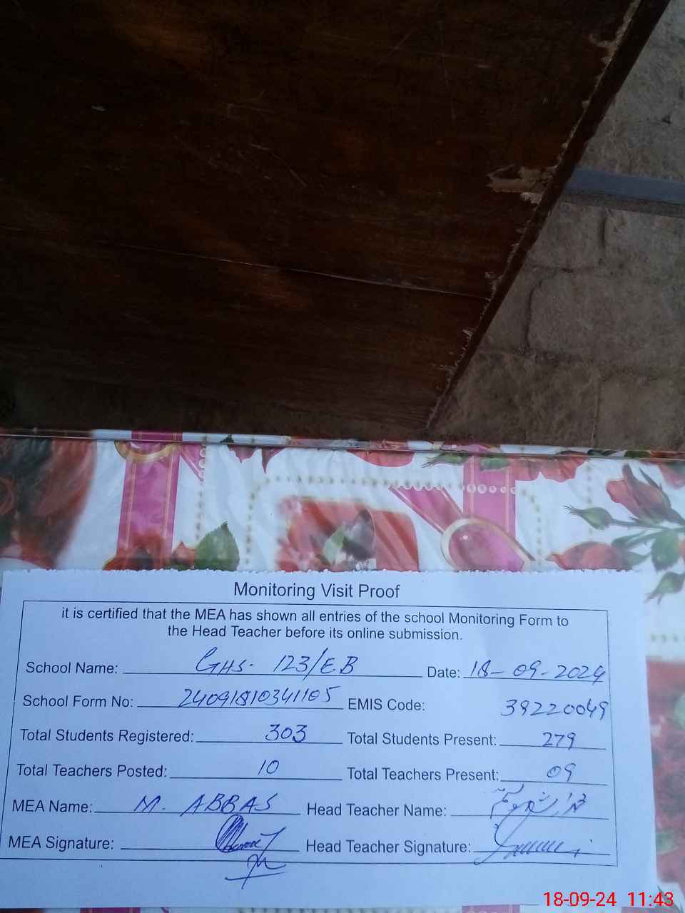 | EMIS Code: 39220049 | Name of School: GHS 123/EB P/O 121/EB ARIF WALA | |||
