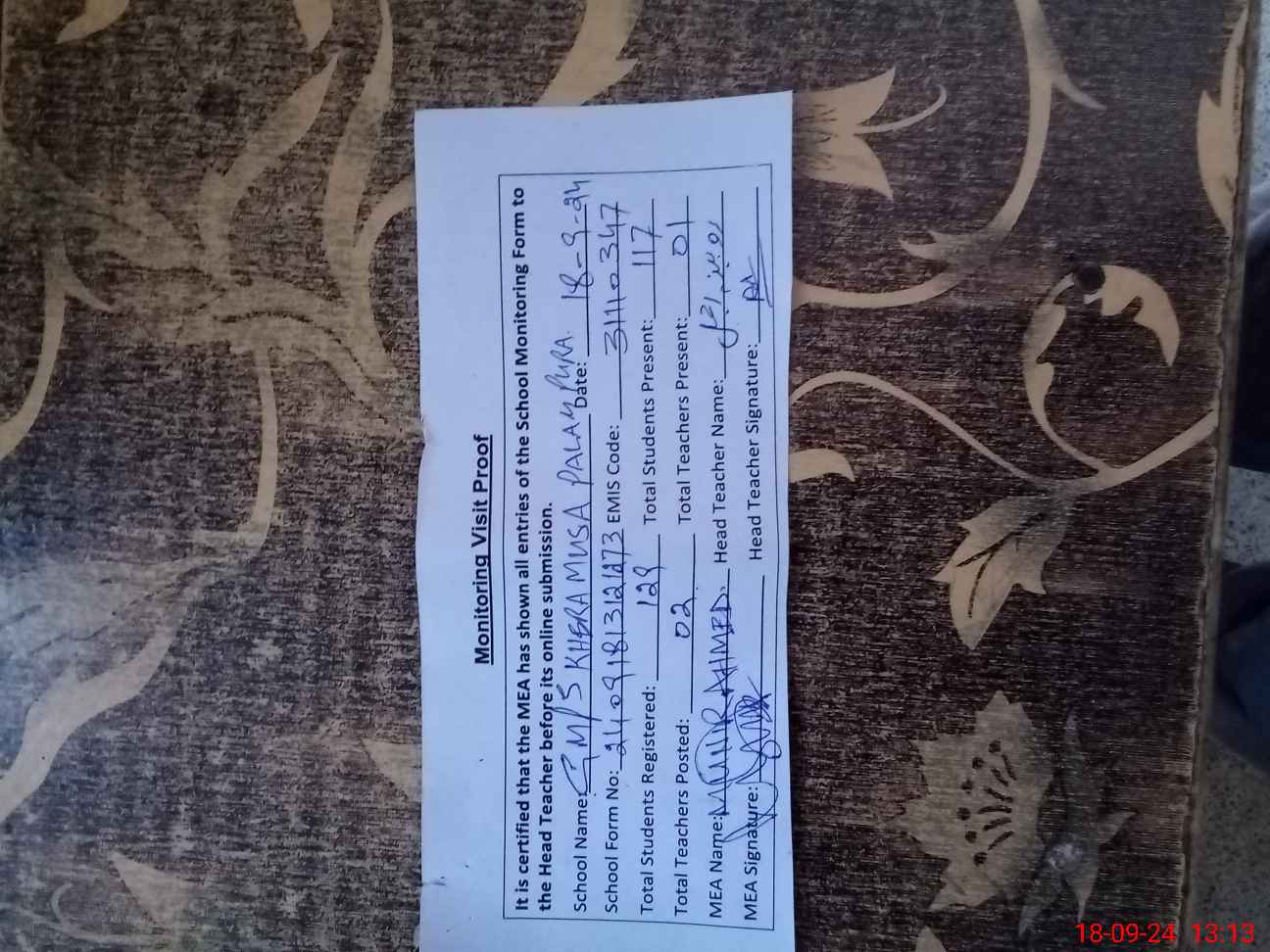 | Attendance Register | Head Teacher | MEA with School | Visit Proof |