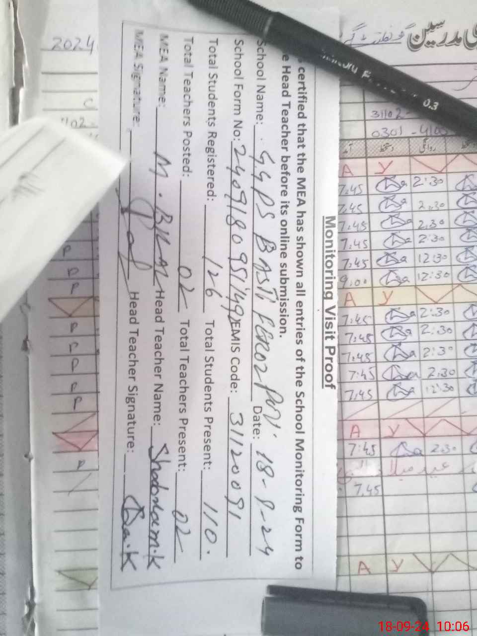 | Attendance Register | Head Teacher | MEA with School | Visit Proof |