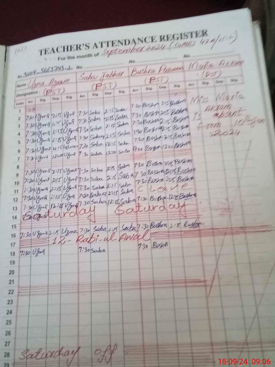 | Remarks (Use Separate Page if Required): Maria Akram ese cnic 3610464020082 is absent since 24 12 2023 no action taken till now Total absentee 269 days till now | |||||
