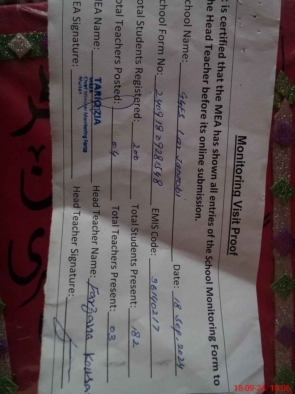| Certified that this School was Inspected by the Undersigned MEA/DMO Today and the Information Stated Above is as Per Record. | |||||