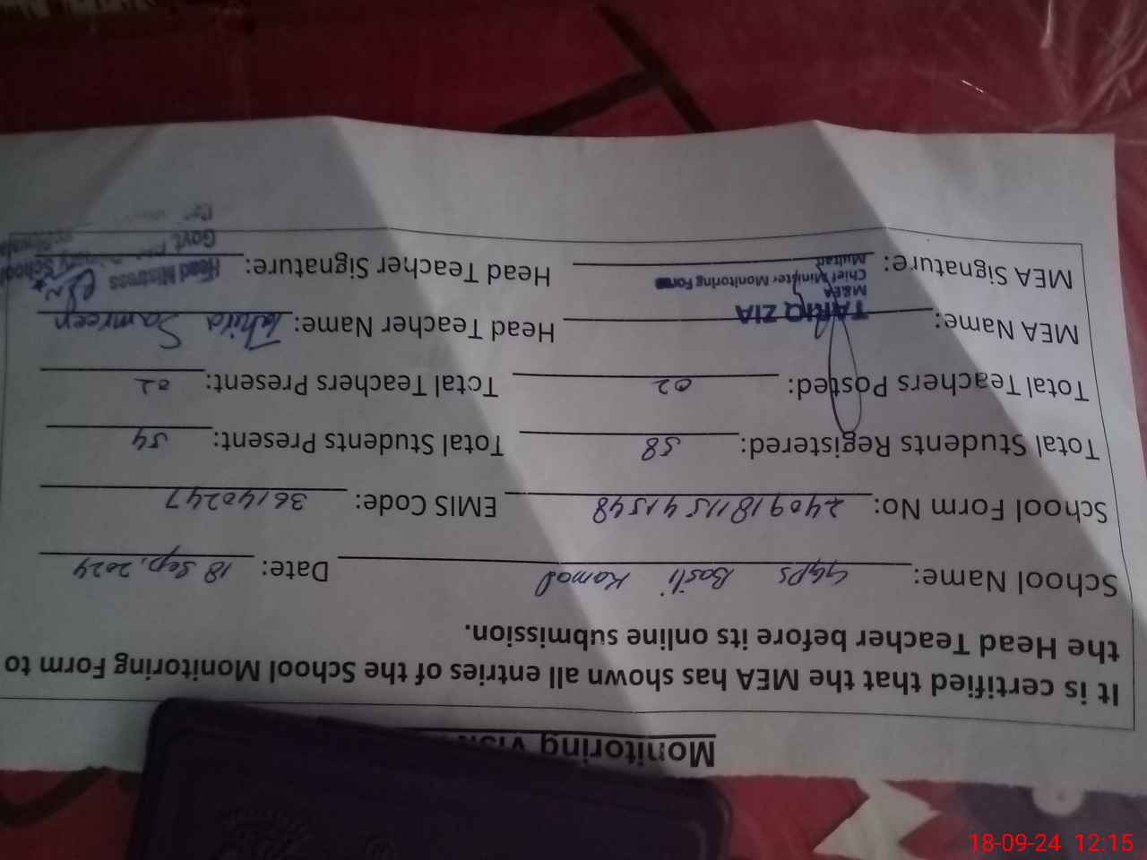 | Certified that this School was Inspected by the Undersigned MEA/DMO Today and the Information Stated Above is as Per Record. | |||||