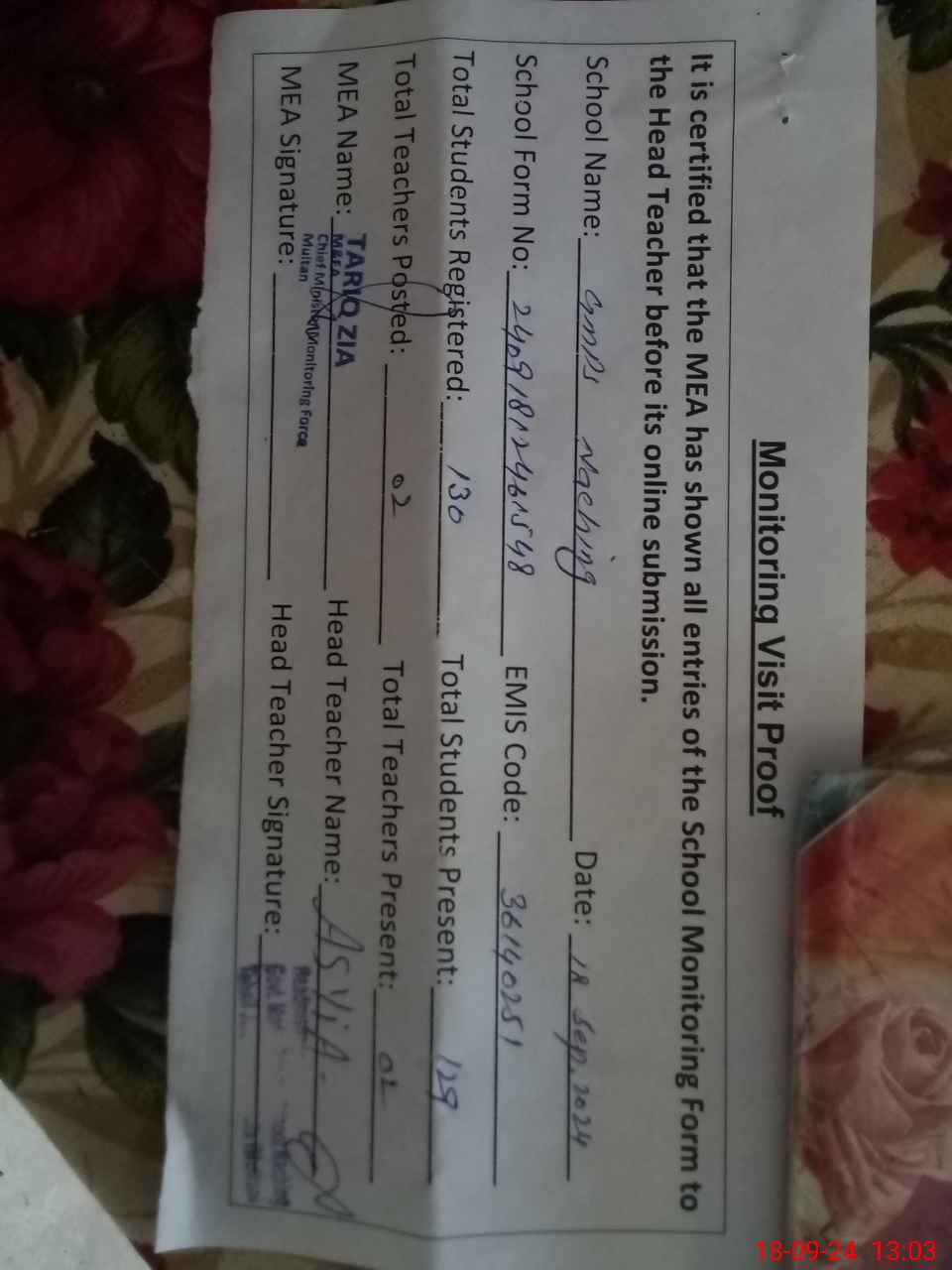 | Attendance Register | Head Teacher | MEA with School | Visit Proof |