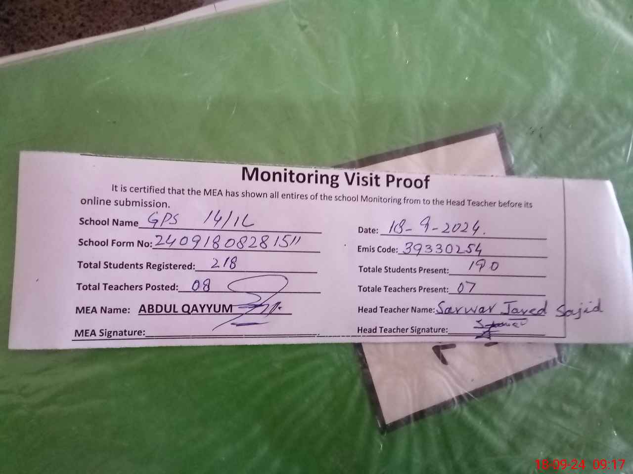 | Attendance Register | Head Teacher | MEA with School | Visit Proof |