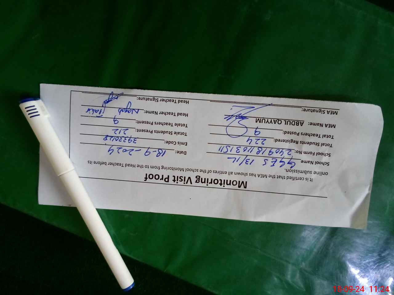 | Attendance Register | Head Teacher | MEA with School | Visit Proof |