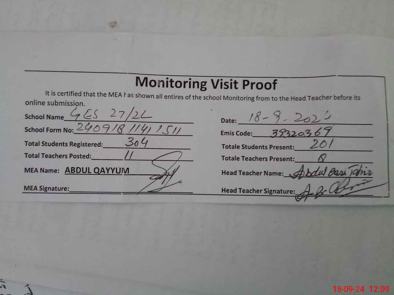 | Attendance Register | Head Teacher | MEA with School | Visit Proof |