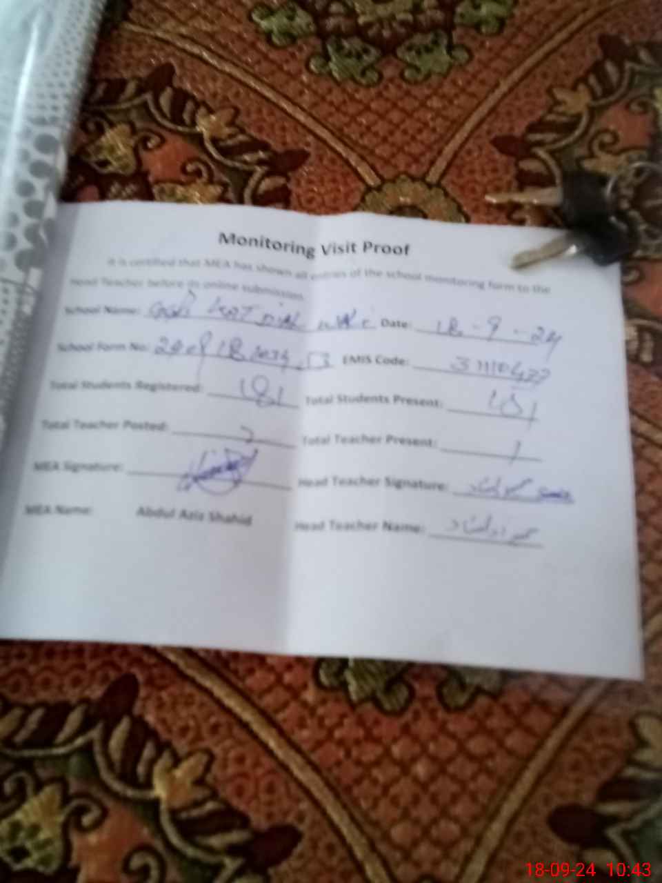 | Attendance Register | Head Teacher | MEA with School | Visit Proof |