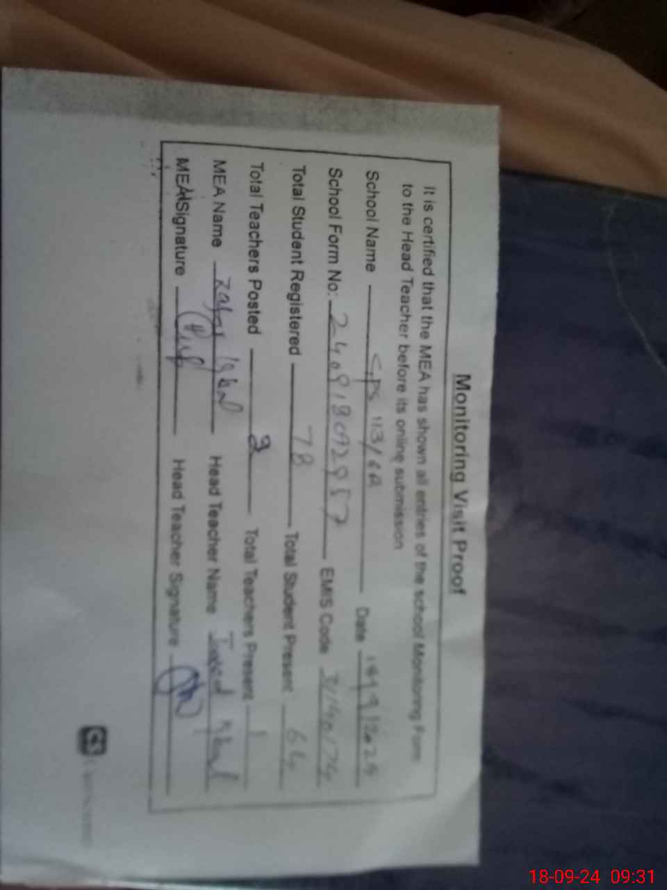 | Attendance Register | Head Teacher | MEA with School | Visit Proof |