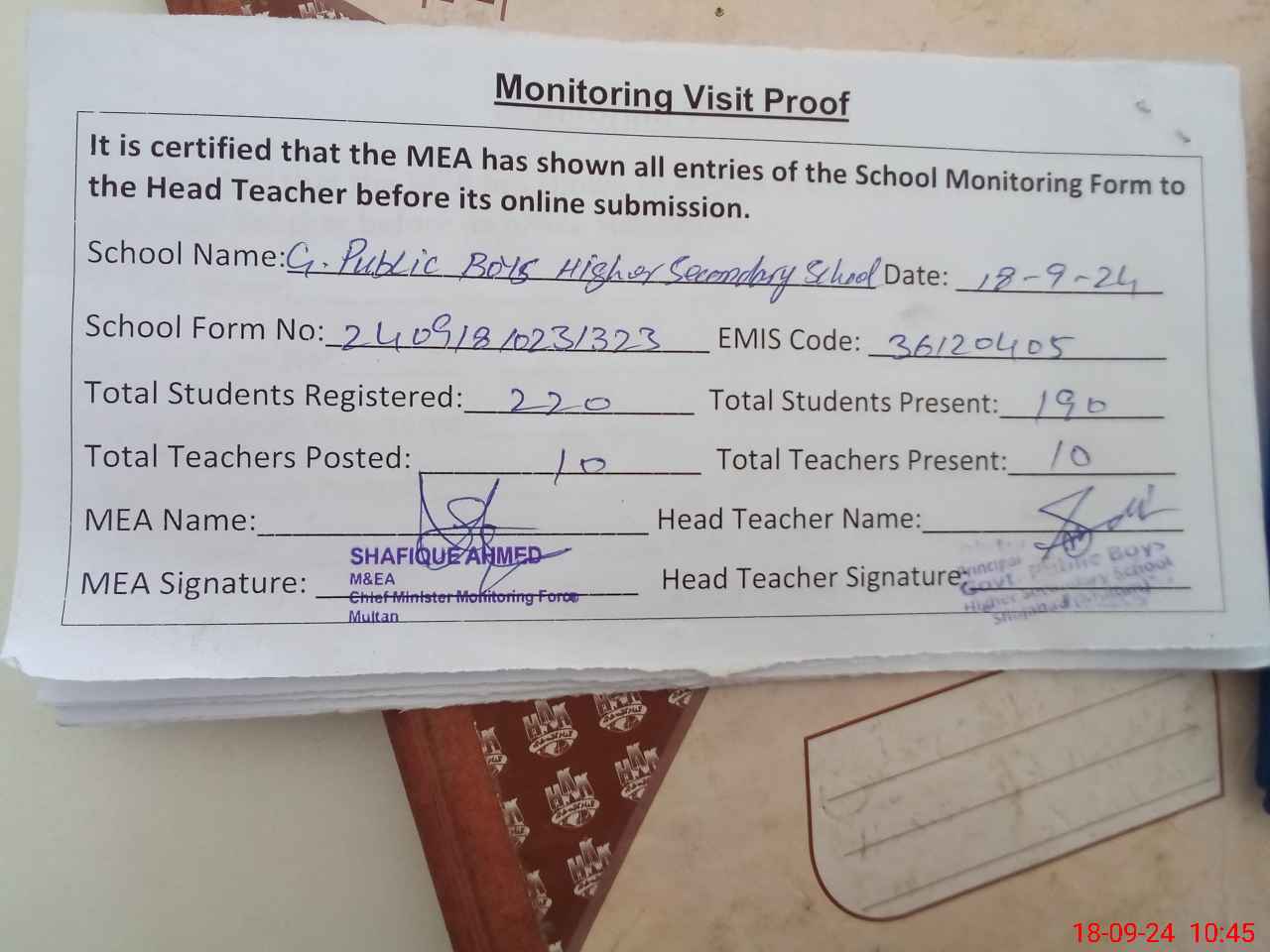 | Attendance Register | Head Teacher | MEA with School | Visit Proof |