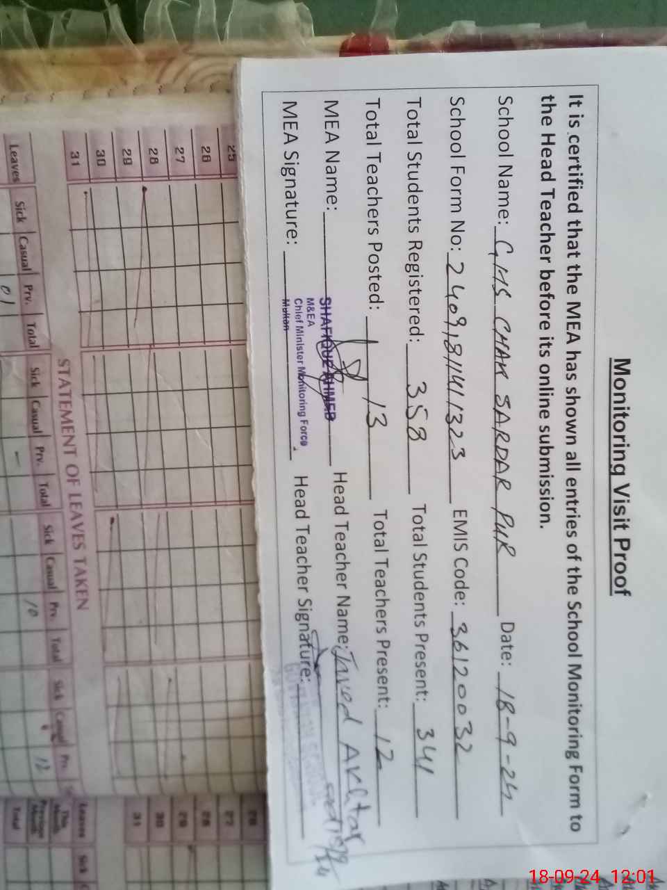 | Attendance Register | Head Teacher | MEA with School | Visit Proof |