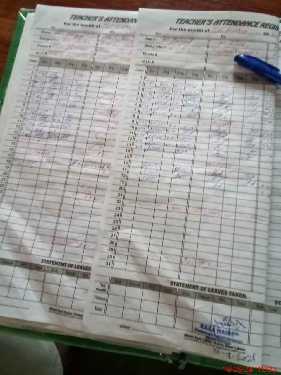 | CNIC | Full Name | Designation | R/C | Absence During Last Calender Month |
