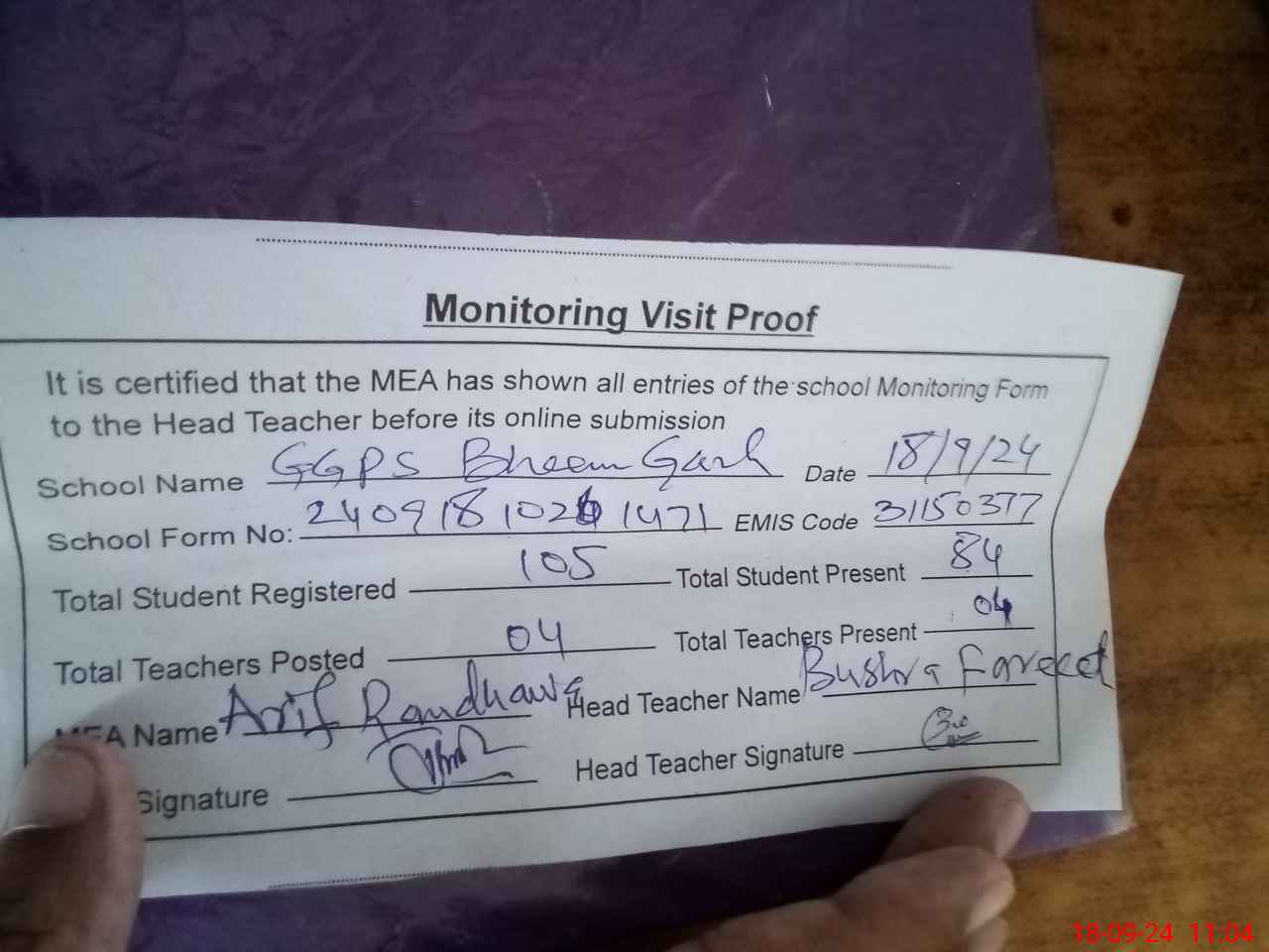 | Attendance Register | Head Teacher | MEA with School | Visit Proof |