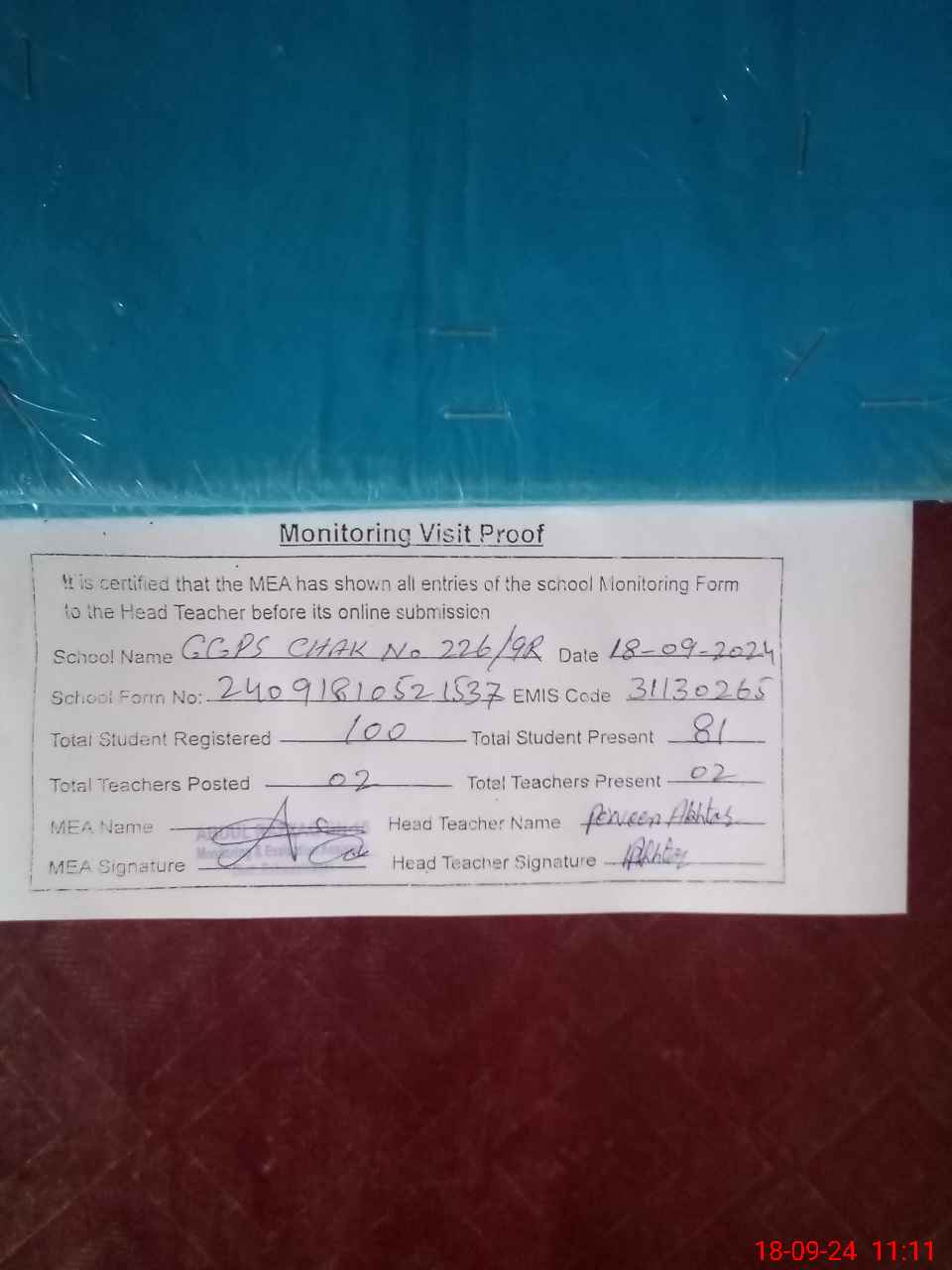 | Attendance Register | Head Teacher | MEA with School | Visit Proof |