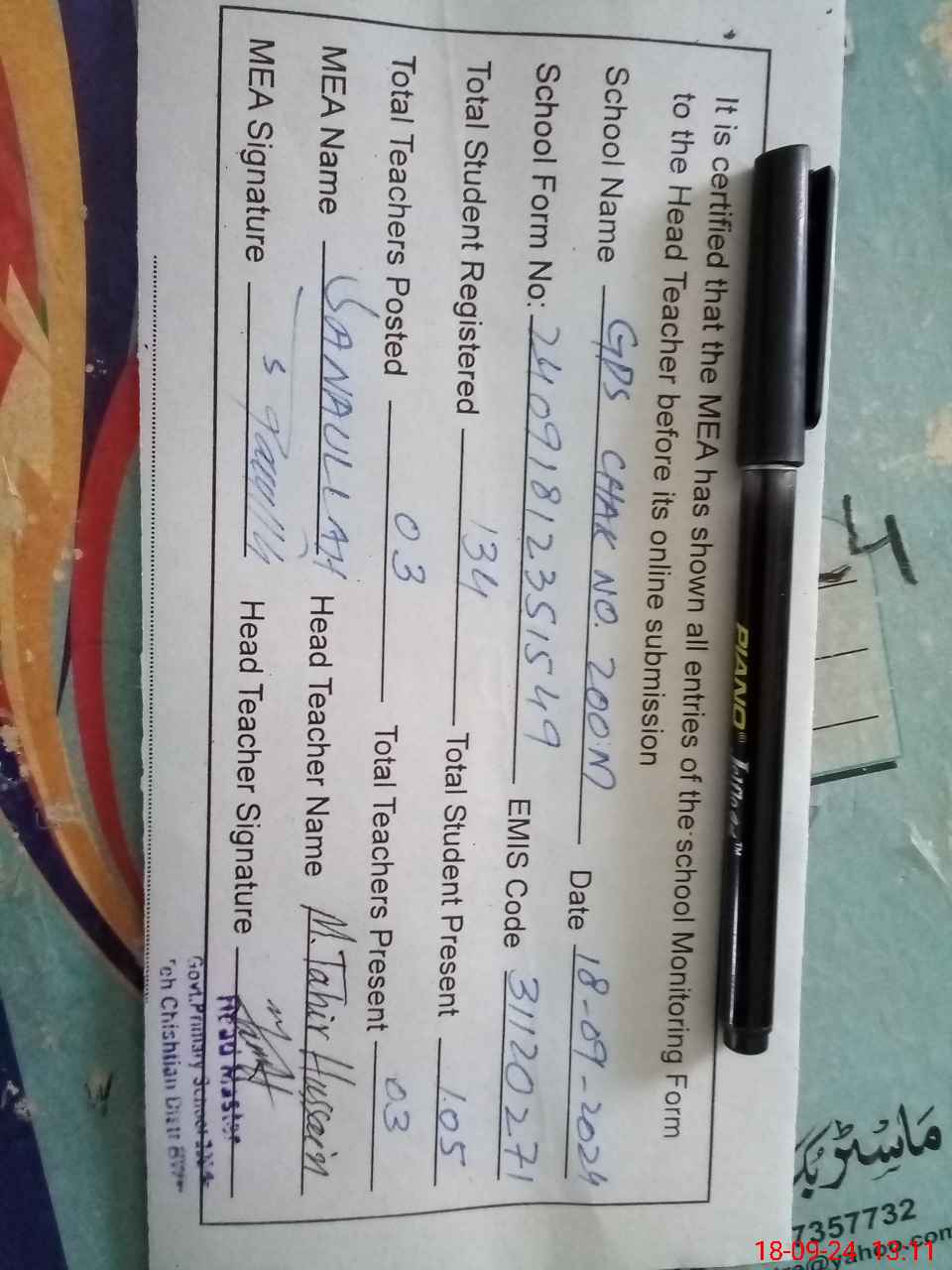 | Name: Mu**** Ta**** Designation: (School Headmaster's/Headmistress's) PST Phone/Cell Number: 03**** |