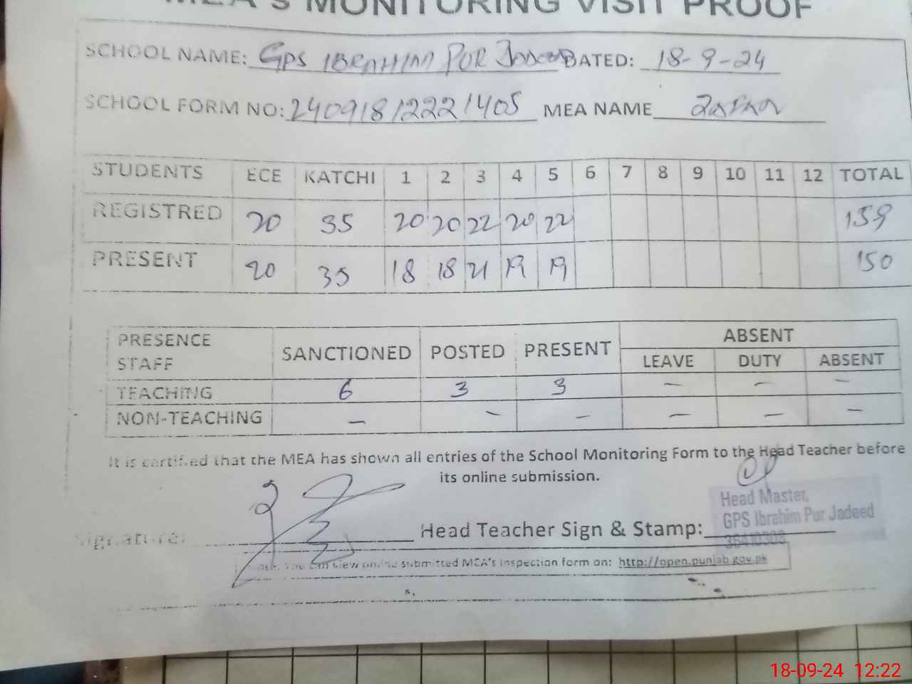 | Attendance Register | Head Teacher | MEA with School | Visit Proof |