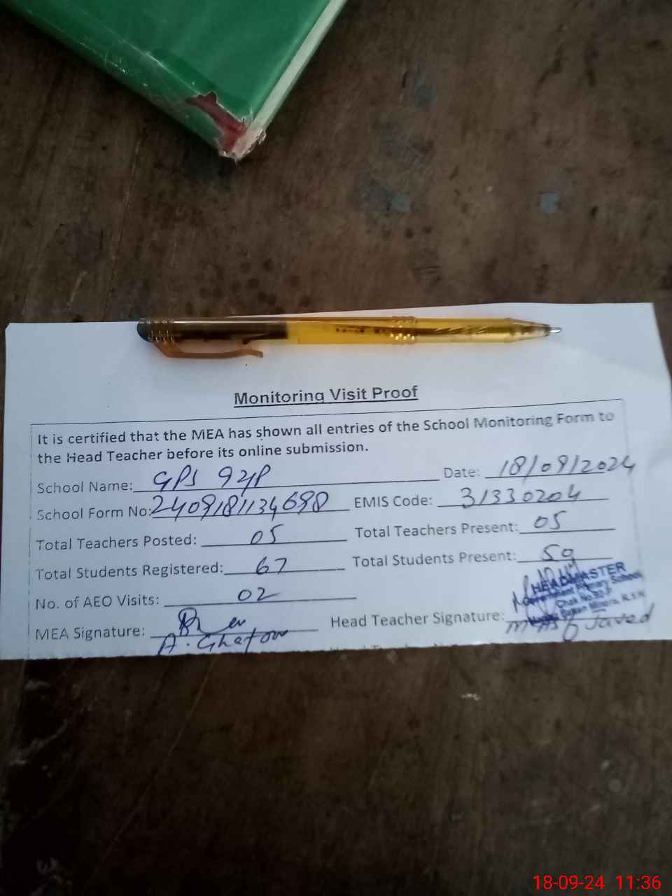 | Attendance Register | Head Teacher | MEA with School | Visit Proof |