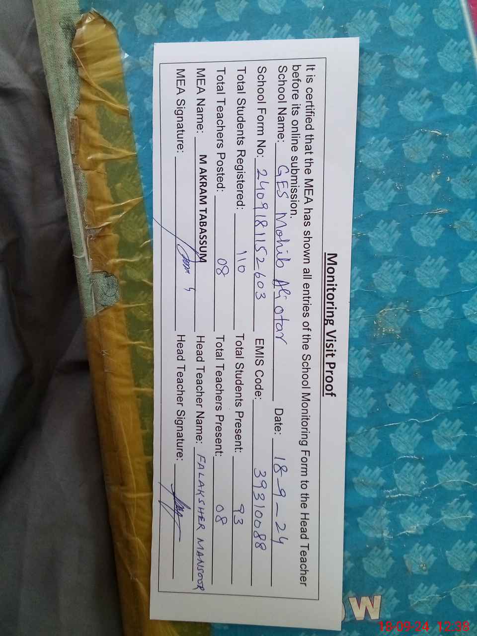 | Attendance Register | Head Teacher | MEA with School | Visit Proof |