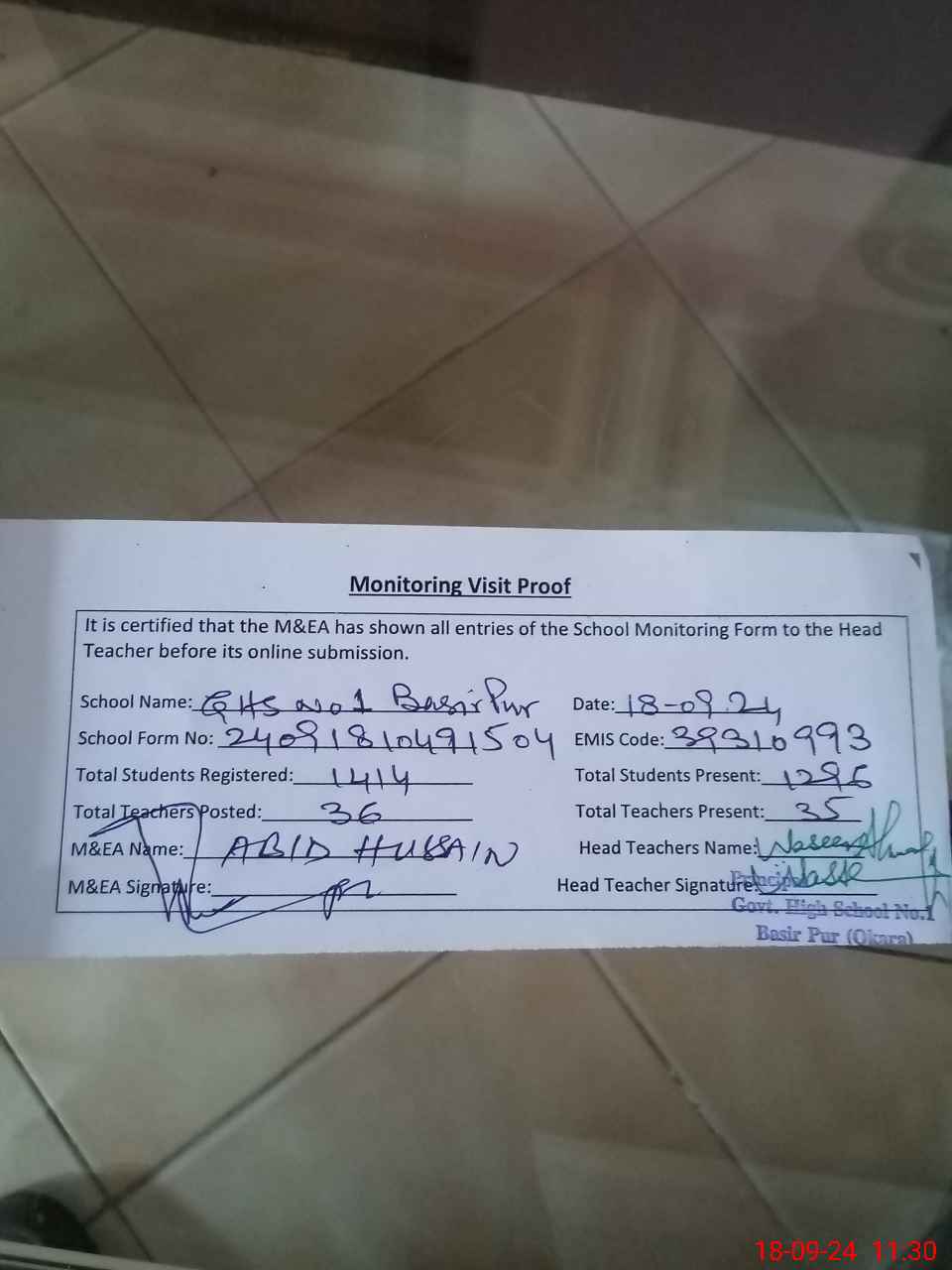 | EMIS Code: 39310993 | Name of School: GHS NO. 1 BASIR PUR MAIN ROAD | |||
