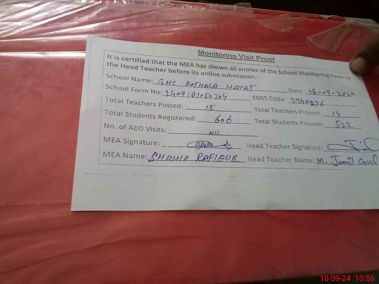 | Attendance Register | Head Teacher | MEA with School | Visit Proof |