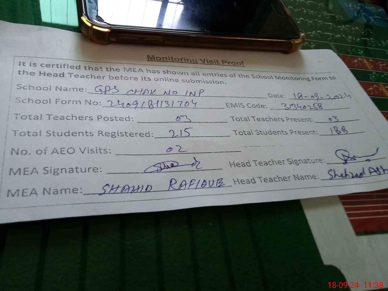 | Attendance Register | Head Teacher | MEA with School | Visit Proof |