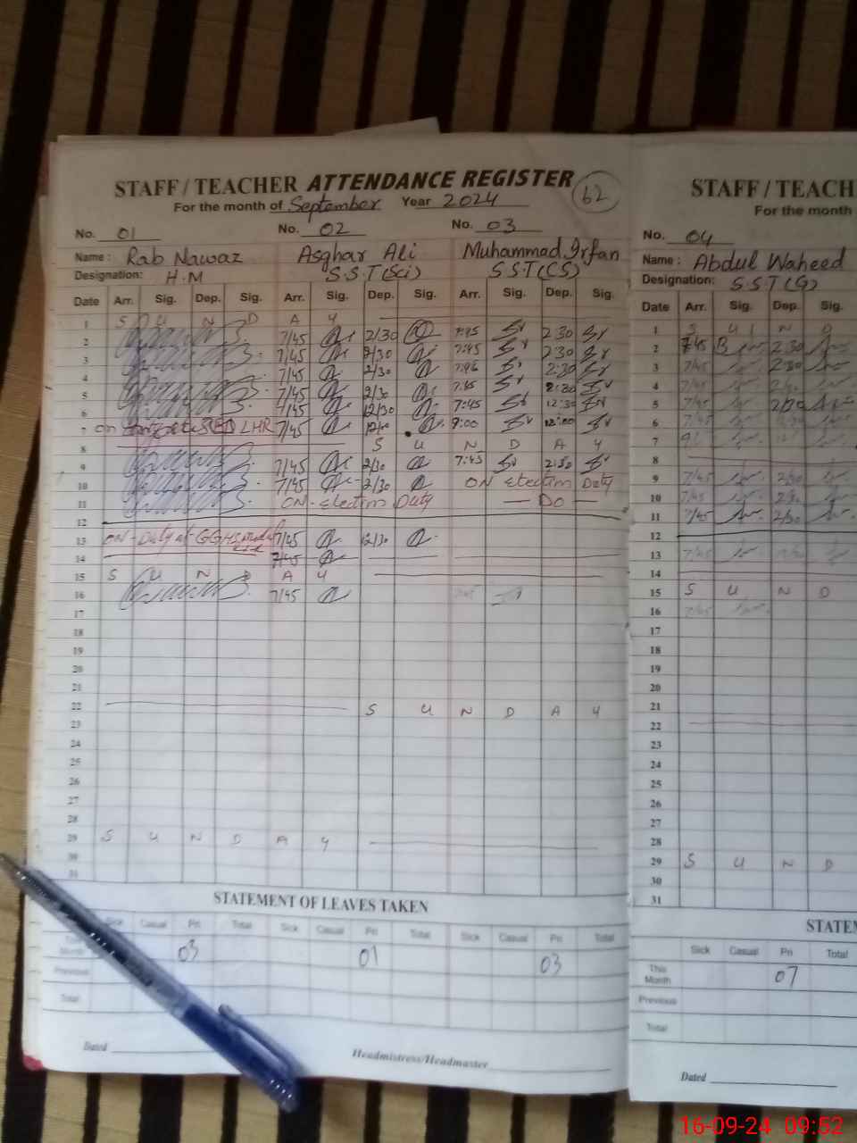 | Leave | Duty | Absent | Maternity | Medical | Ex- Pak |