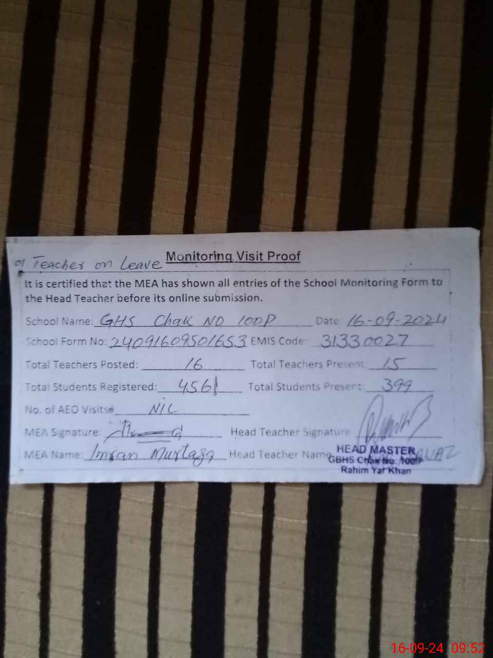 | Attendance Register | Head Teacher | MEA with School | Visit Proof |