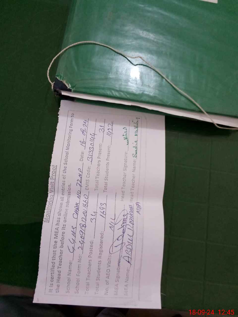 | Attendance Register | Head Teacher | MEA with School | Visit Proof |