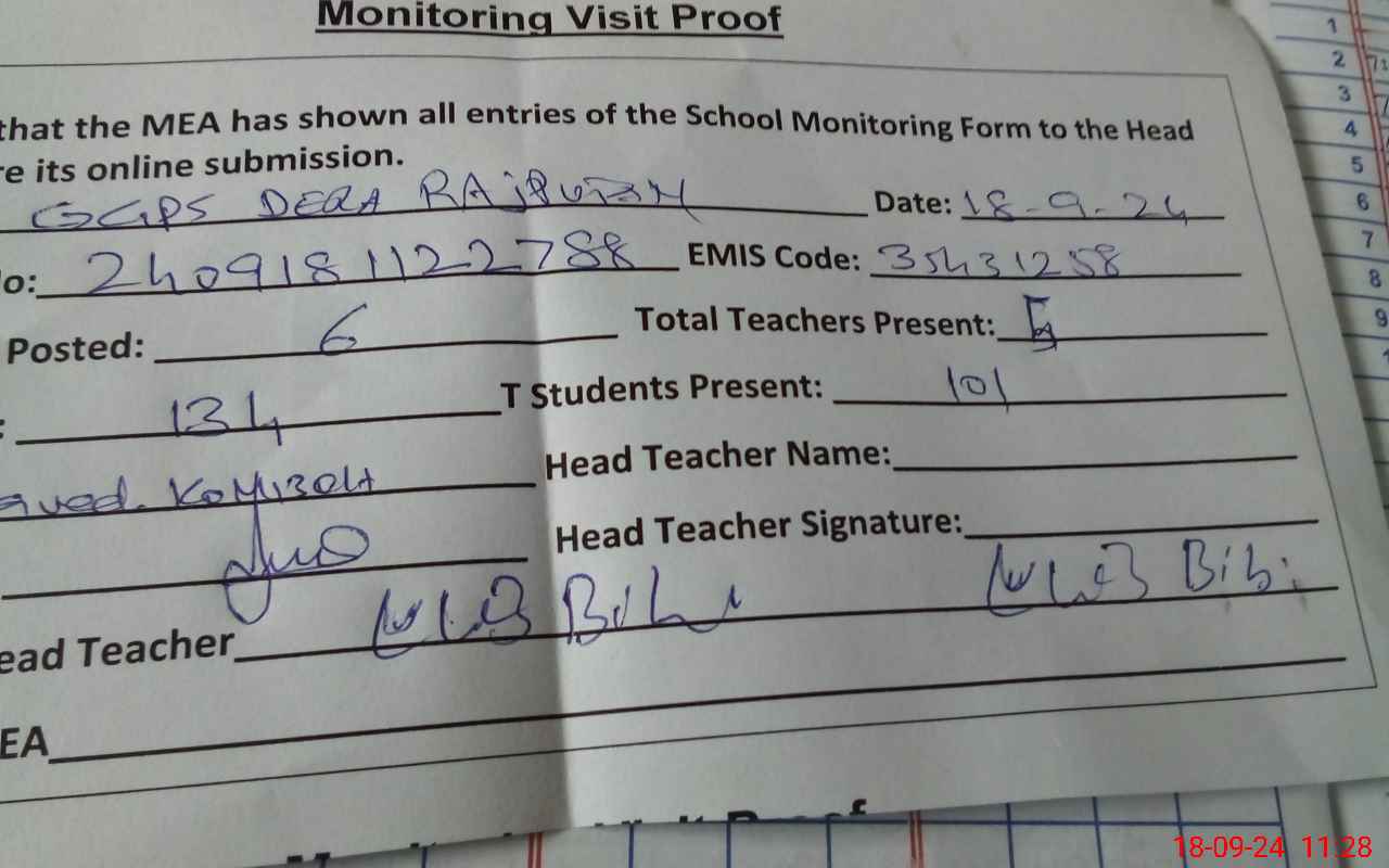 | Attendance Register | Head Teacher | MEA with School | Visit Proof |