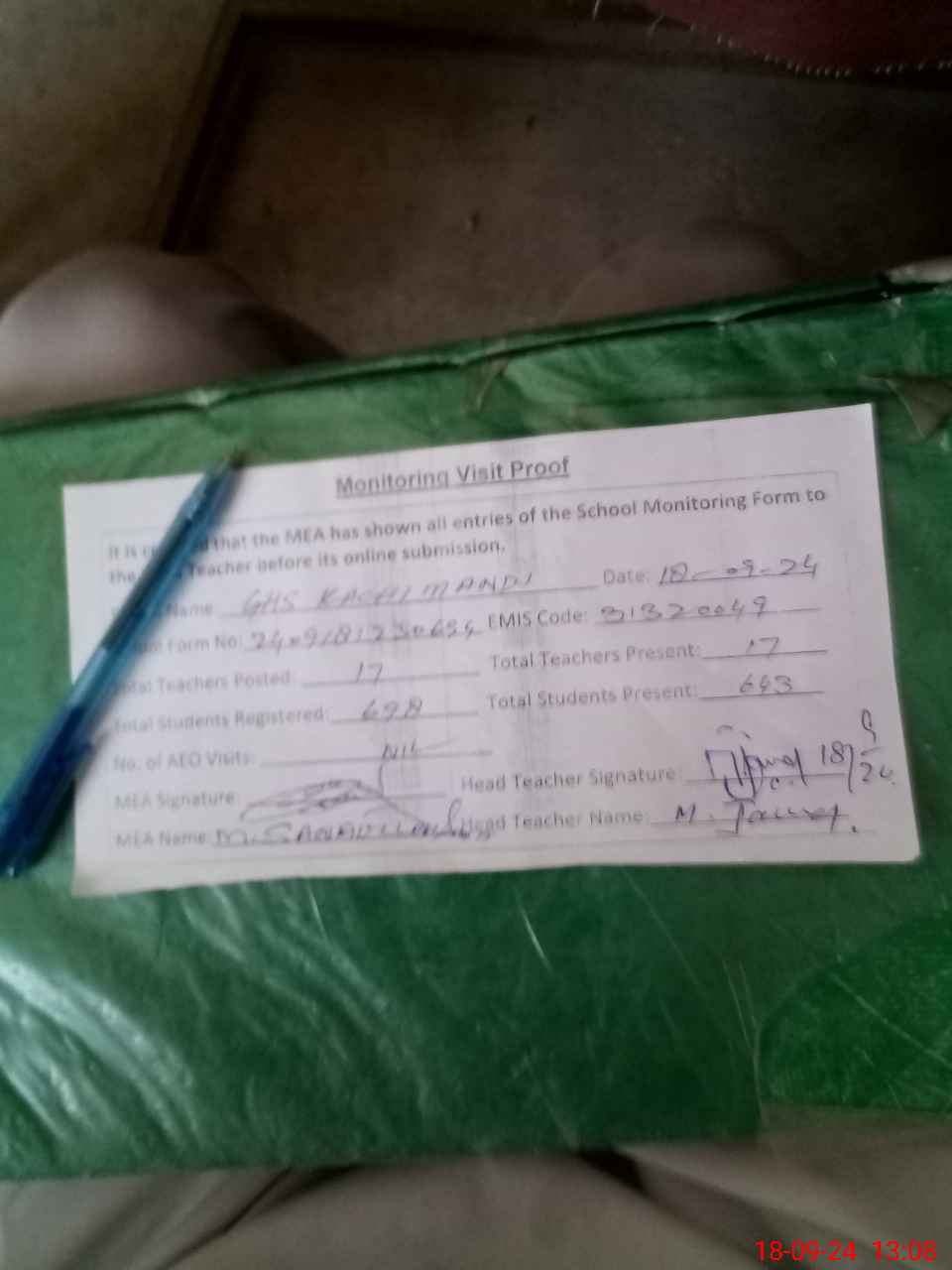 | Attendance Register | Head Teacher | MEA with School | Visit Proof |