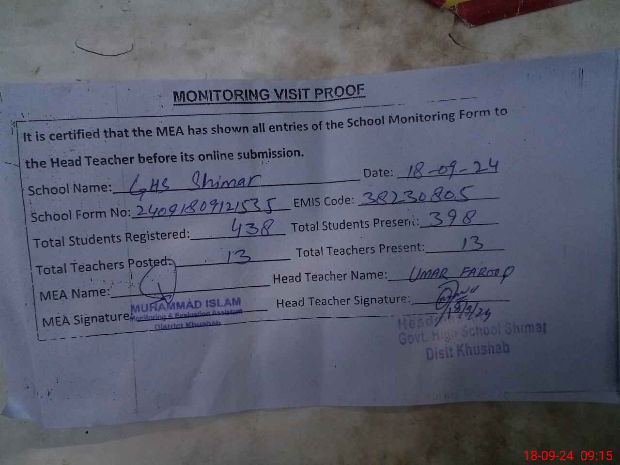 | EMIS Code: 38230805 | Name of School: GHS SHIMAR | |||