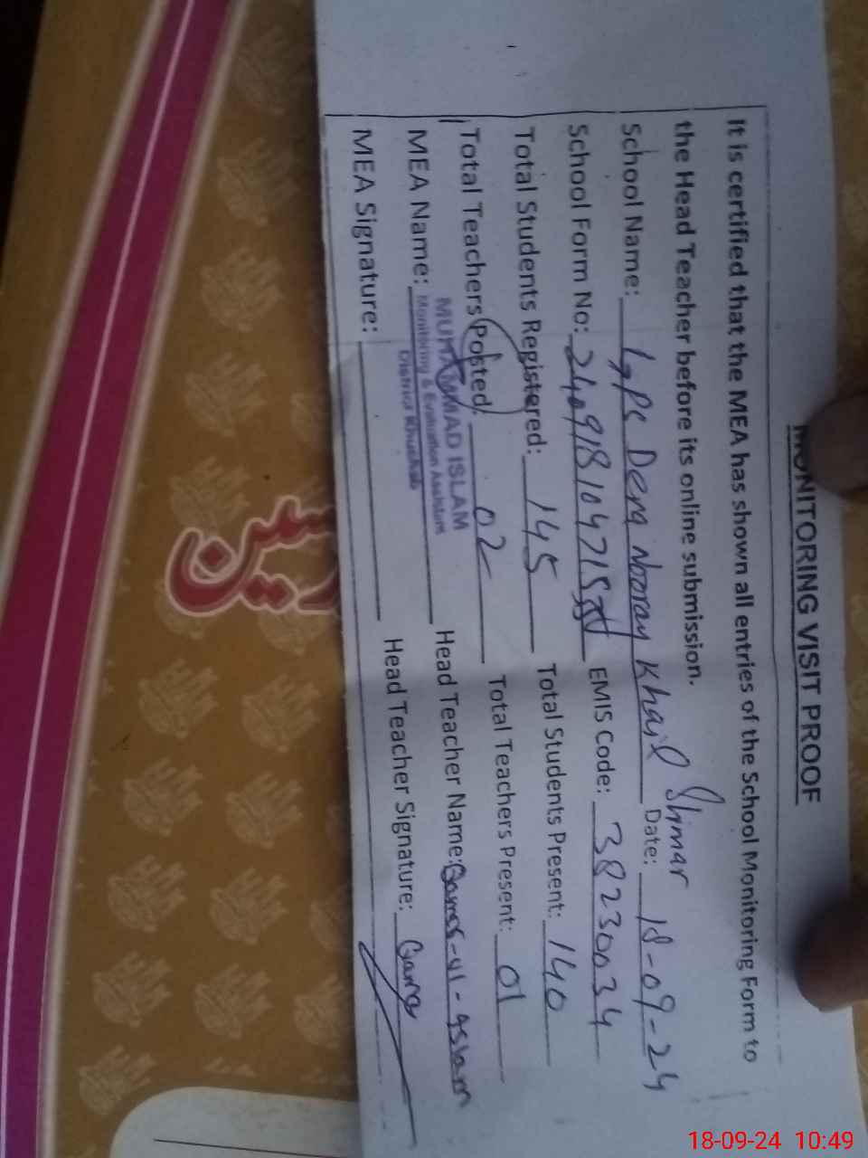 | Attendance Register | Head Teacher | MEA with School | Visit Proof |