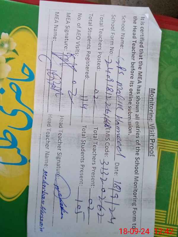 | Attendance Register | Head Teacher | MEA with School | Visit Proof |