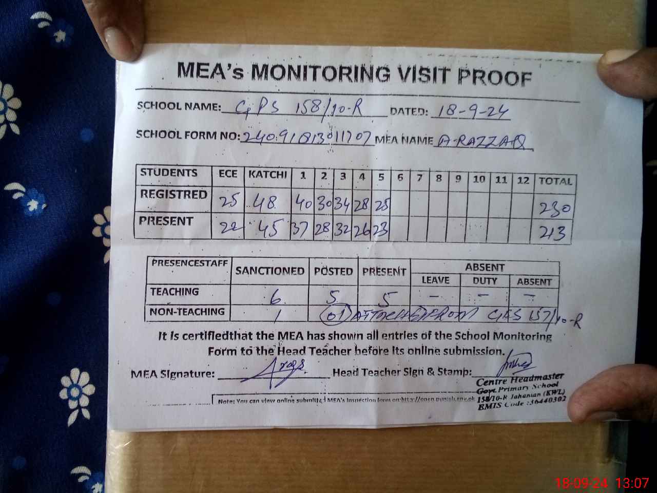 | Attendance Register | Head Teacher | MEA with School | Visit Proof |