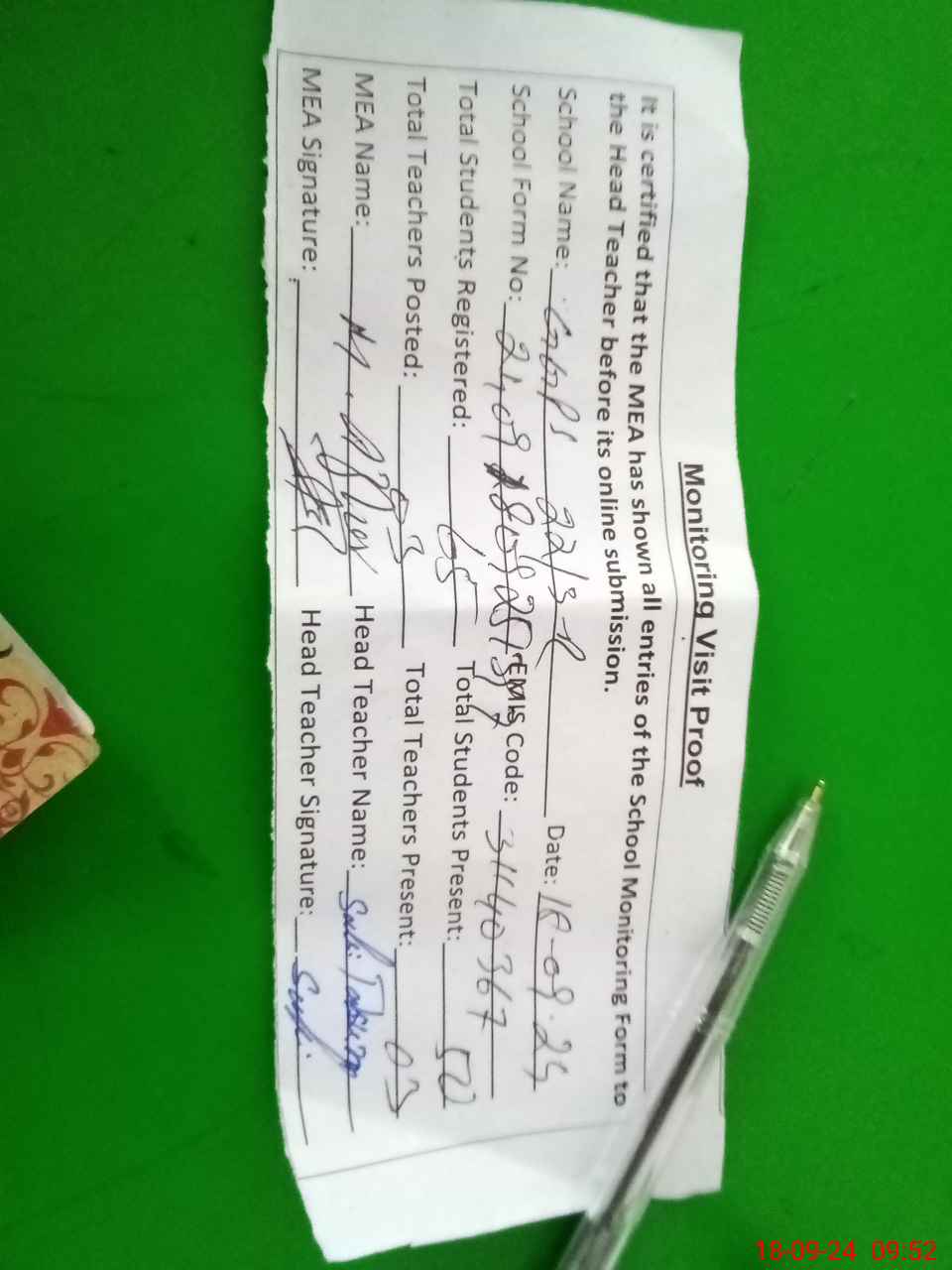 | Attendance Register | Head Teacher | MEA with School | Visit Proof |