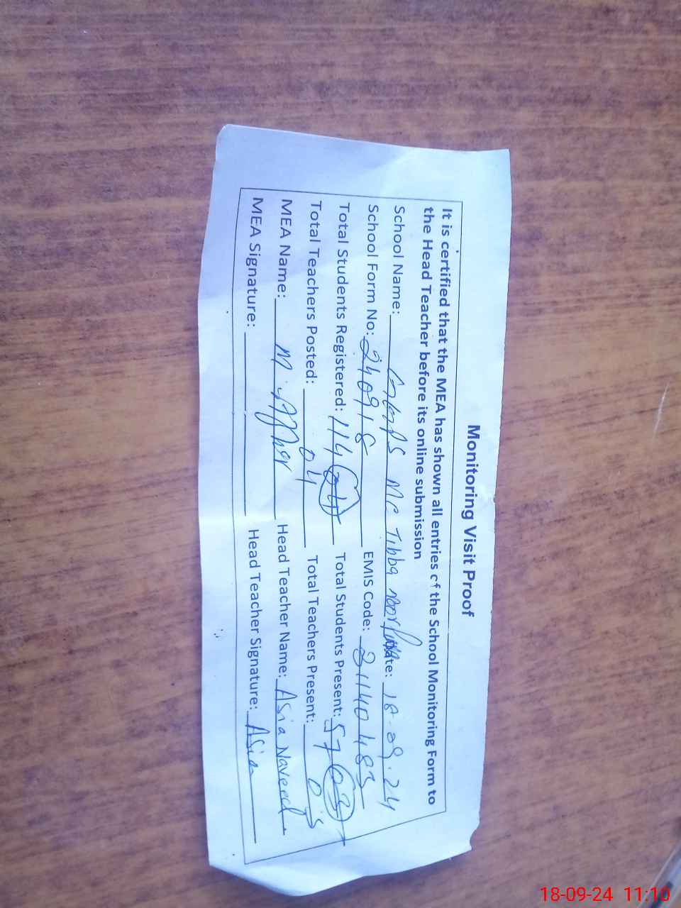| Attendance Register | Head Teacher | MEA with School | Visit Proof |