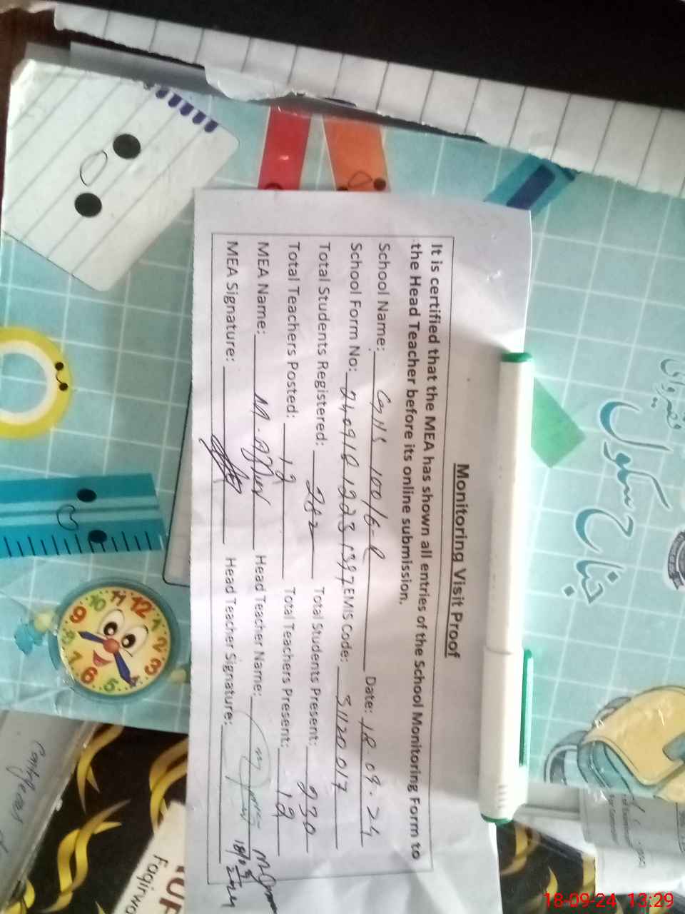 | Attendance Register | Head Teacher | MEA with School | Visit Proof |