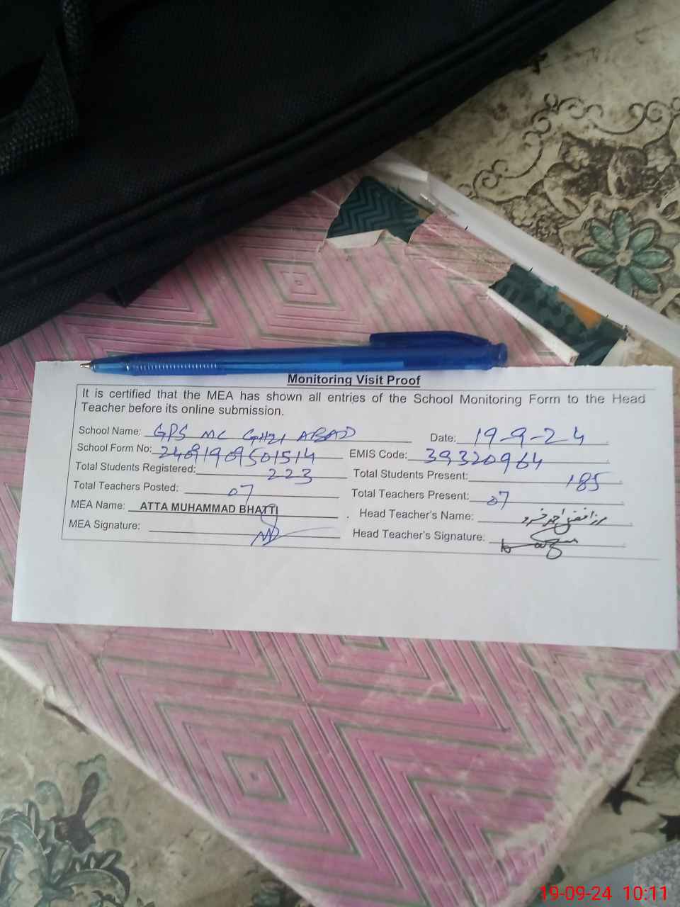 | Attendance Register | Head Teacher | MEA with School | Visit Proof |