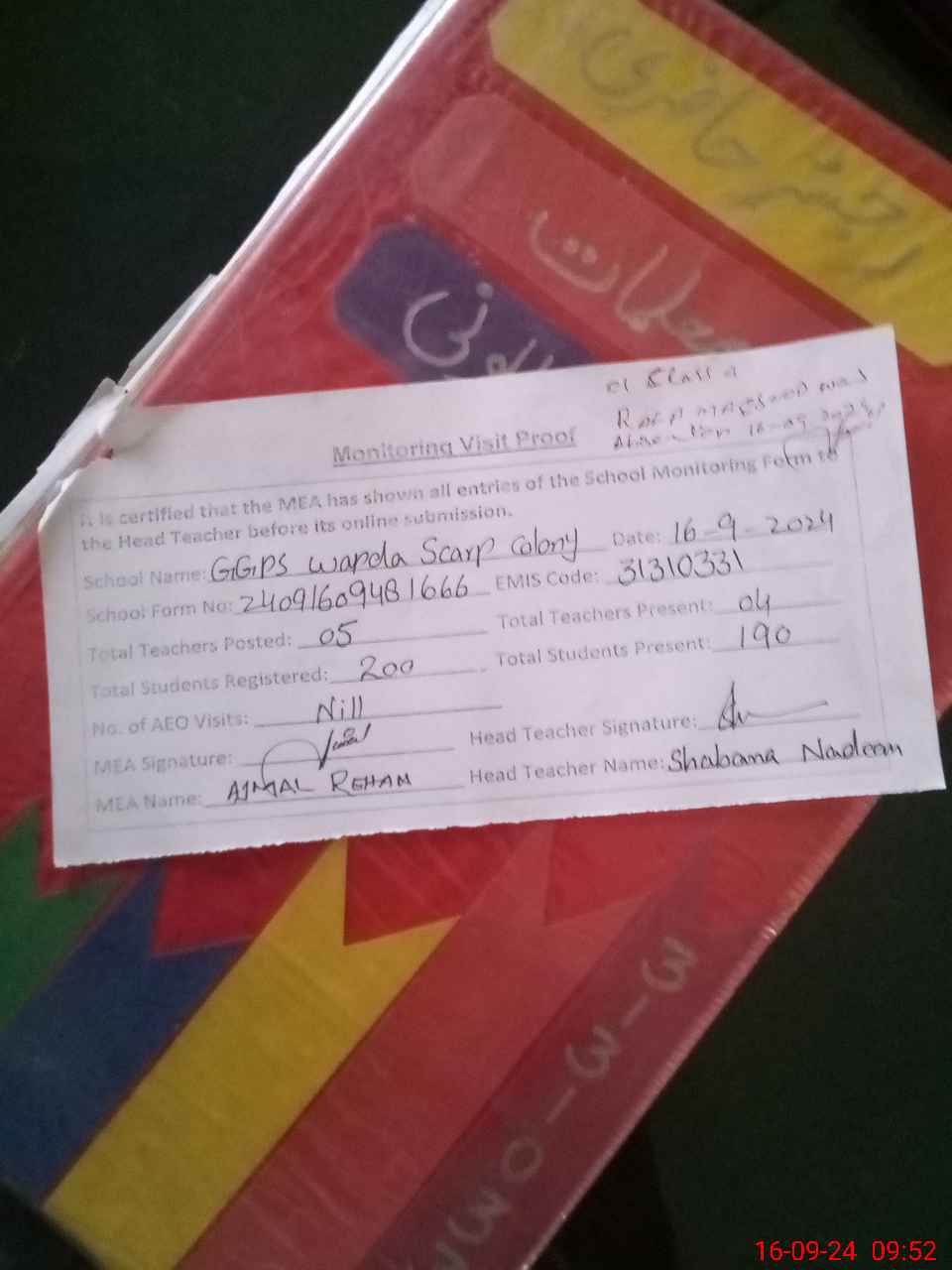 | EMIS Code: 31310331 | Name of School: GGPS WAPDA COLONY (After Noon) | |||