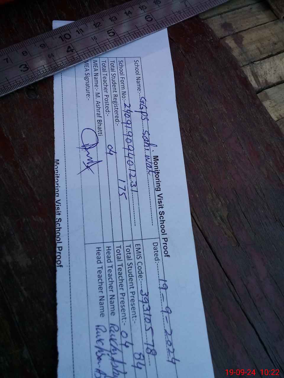 | Name: RU**** AS**** Designation: (School Headmaster's/Headmistress's) PST Phone/Cell Number: 03**** |