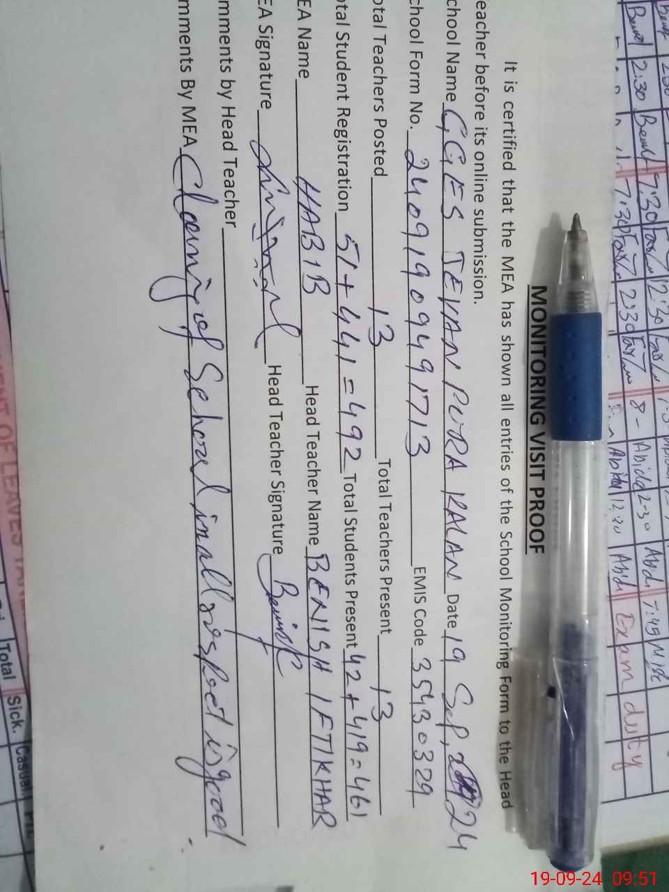 | Attendance Register | Head Teacher | MEA with School | Visit Proof |