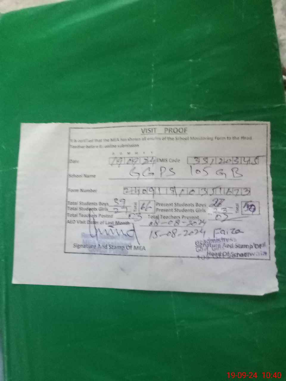 | Certified that this School was Inspected by the Undersigned MEA/DMO Today and the Information Stated Above is as Per Record. | |||||