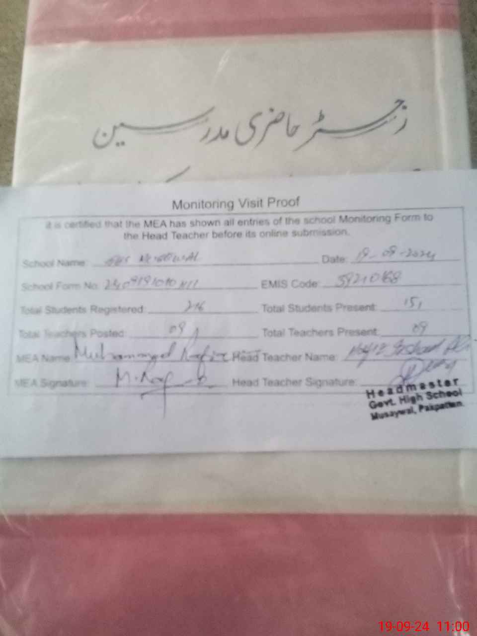 | Attendance Register | Head Teacher | MEA with School | Visit Proof |