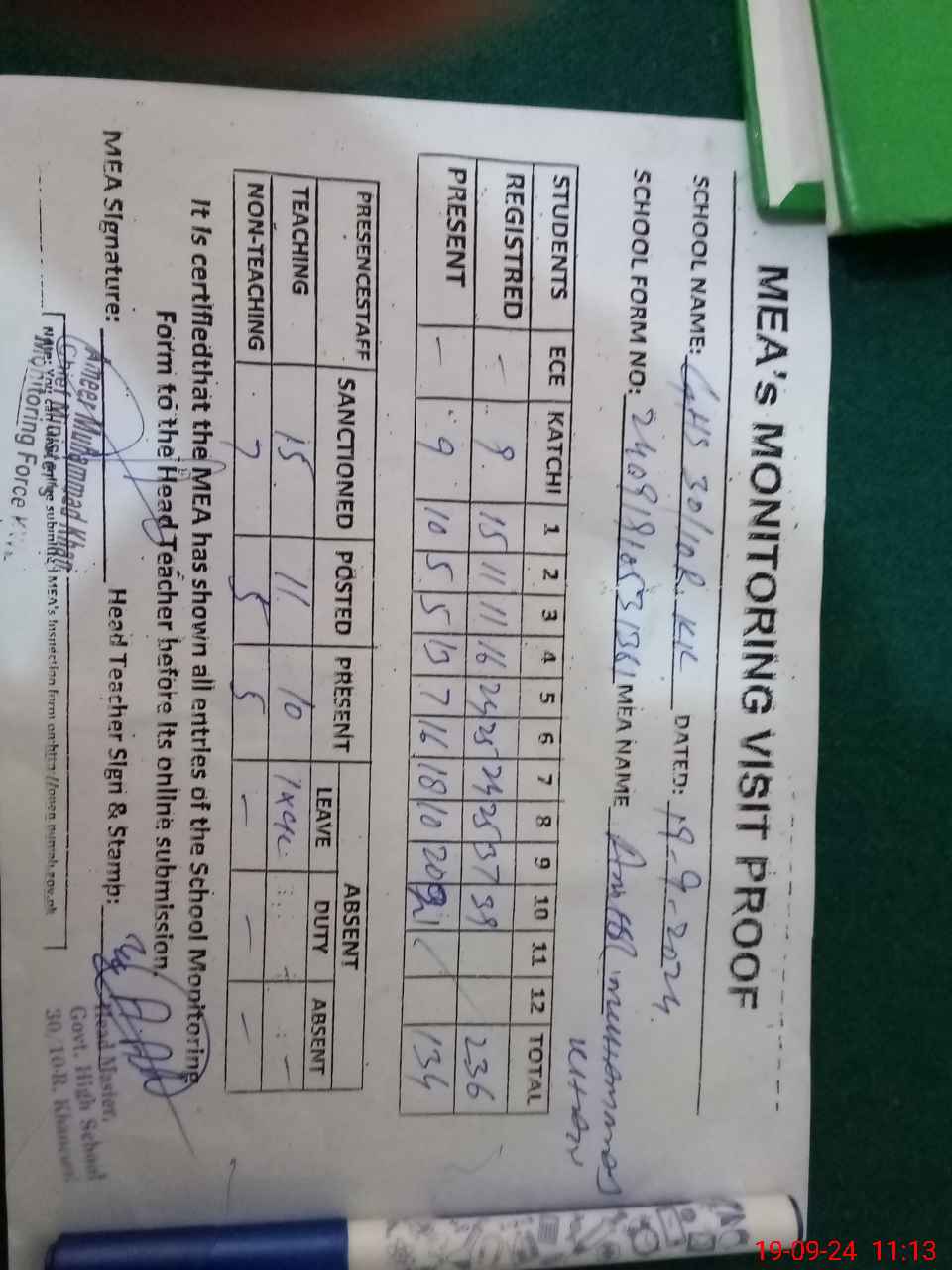 | Attendance Register | Head Teacher | MEA with School | Visit Proof |