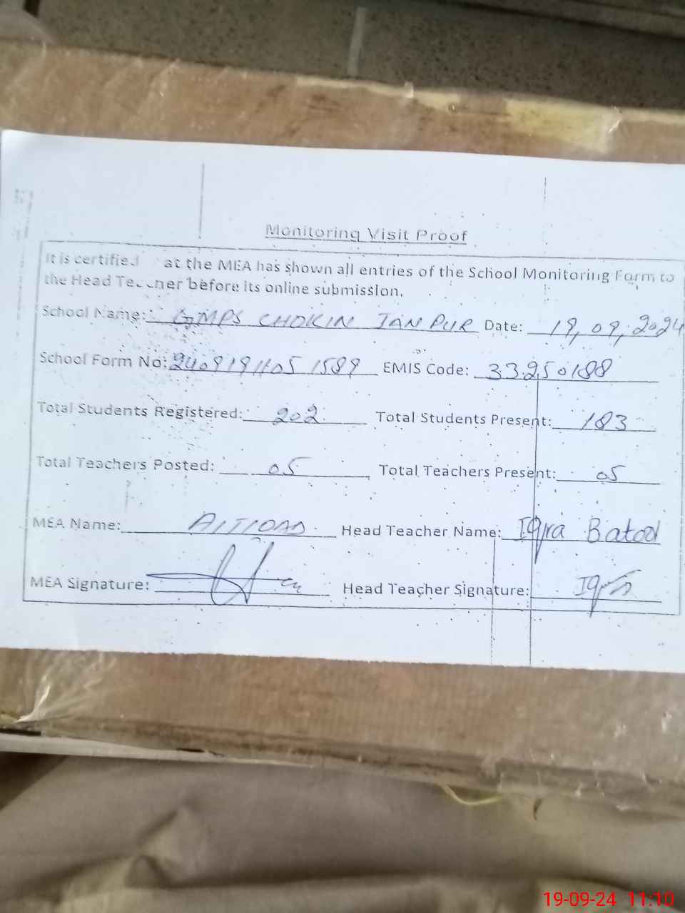 | EMIS Code: 33250188 | Name of School: GMPS CHOKIN JAN PUR | |||