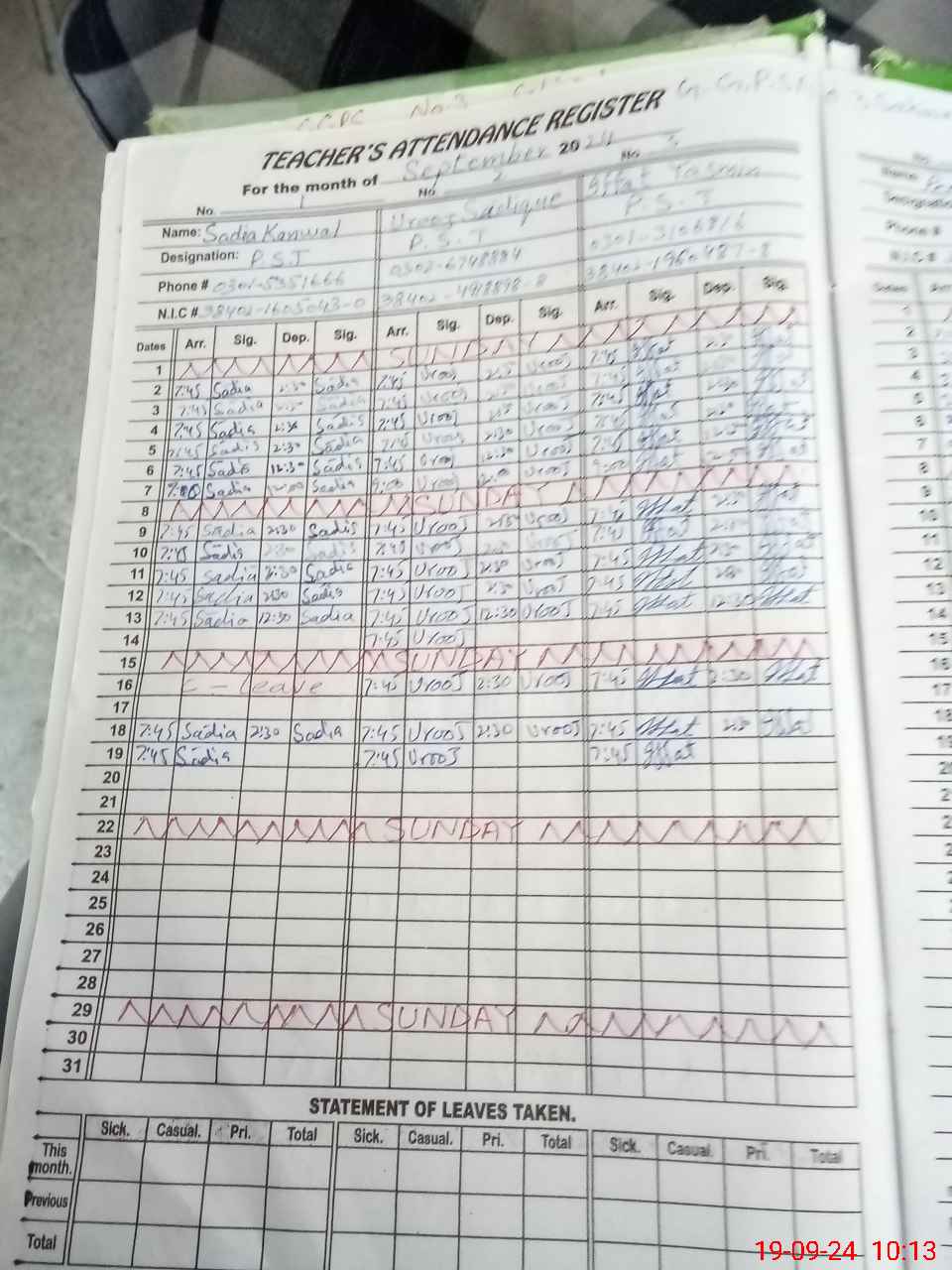 | CNIC | Full Name | Designation | R/C | Absence during last cal. month |