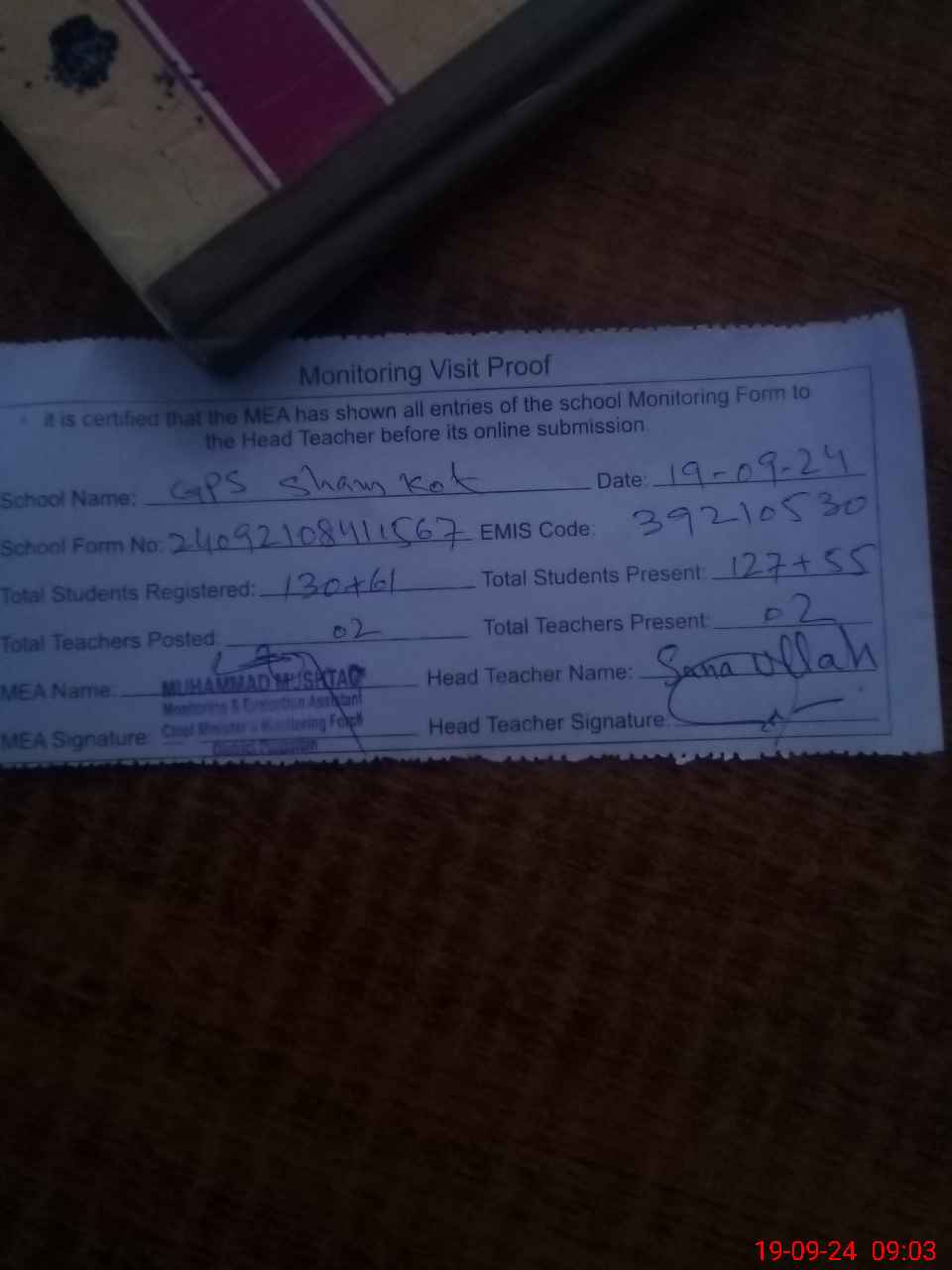 | Attendance Register | Head Teacher | MEA with School | Visit Proof |