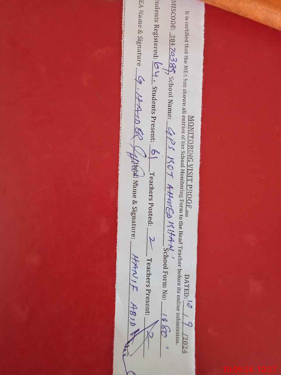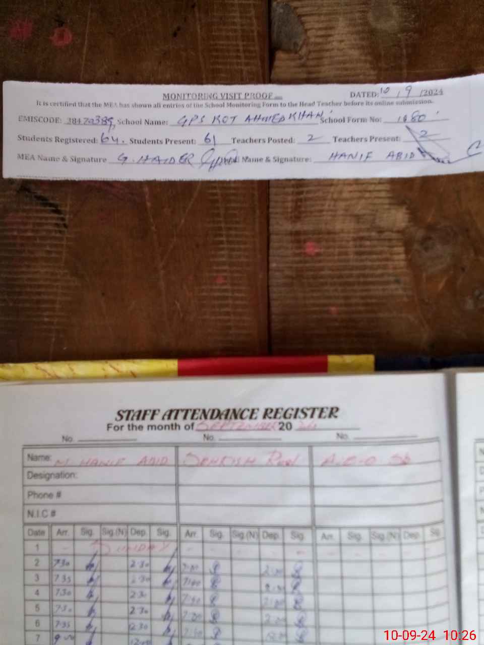 | Attendance Register | Head Teacher | MEA with School | Visit Proof |