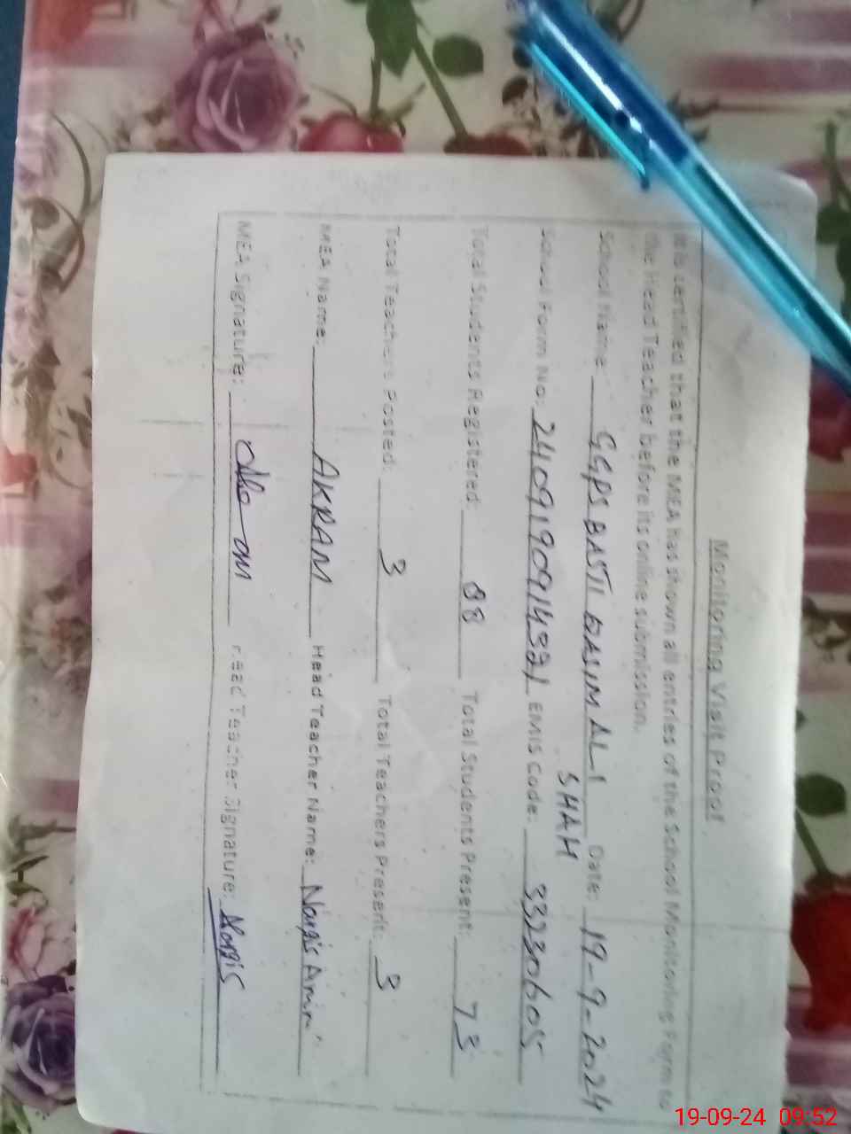 | Attendance Register | Head Teacher | MEA with School | Visit Proof |